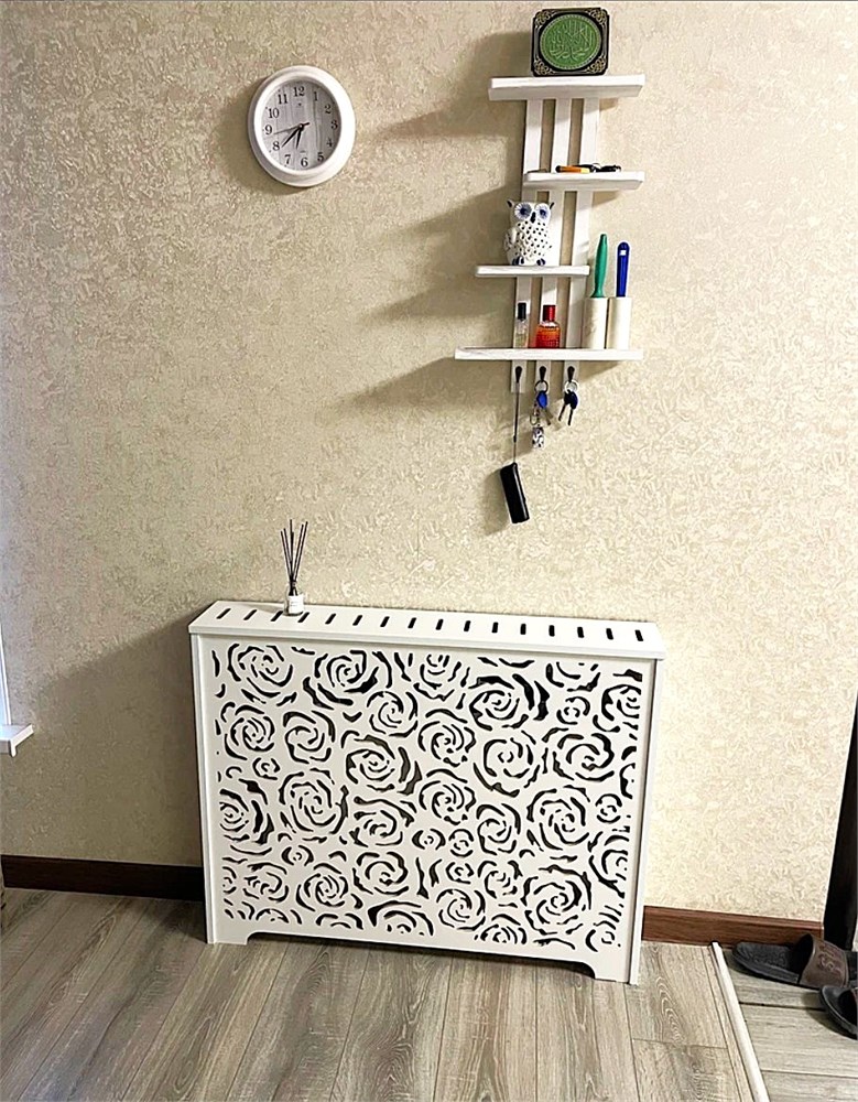 Экран короб для радиатора отопления из МДФ. Решетка для батарей. Цвет Белый . ширина 100 см высота 70 см глубина 18 см Узор Розы.